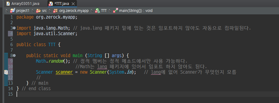 모든 소스파일에서 import문은 package문 다음에, 그리고 클래스 선언문 이전에 위치한다.