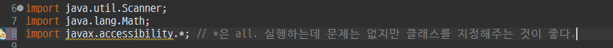 같은 패키지에서 여러 개의 클래스가 사용될 때, import문을 여러 번 사용하는 대신 패키지명.*을 이용해서 지정된 패키지에 속하는 모든 클래스를 패키지명 없이 사용할 수 있다.